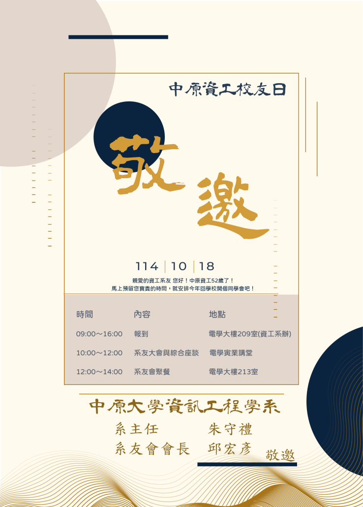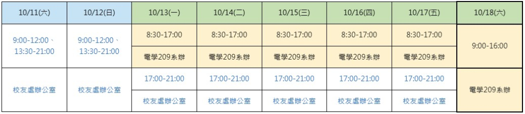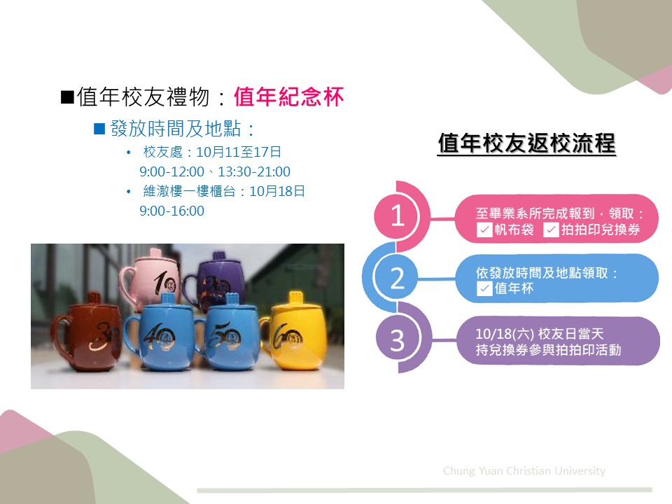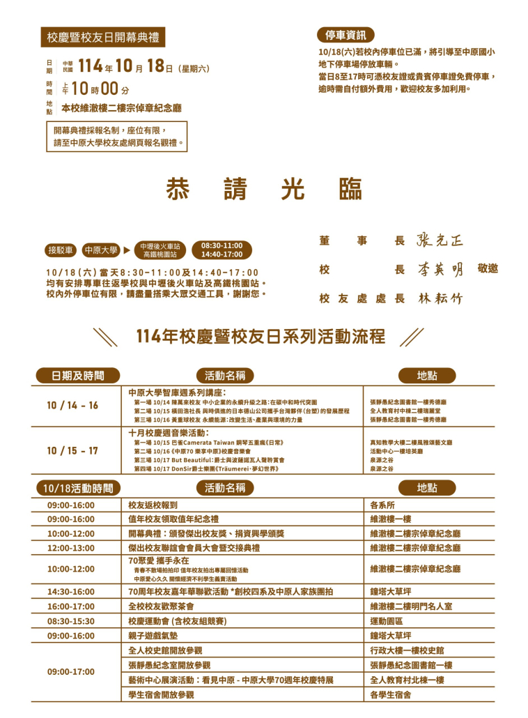 今年適逢中原大學70周年校慶,將擴大舉辦相關活動,校友返校報到時間延長為10/11(六)至10/18(六),請校友撥空回來走走,報到的時間地點如下表。