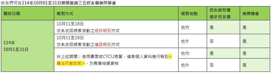 ※三五好友自行舉辦同學會,可參加<萬人返校報到抽獎>活動,若在校內舉辦再領<校友返校禮>